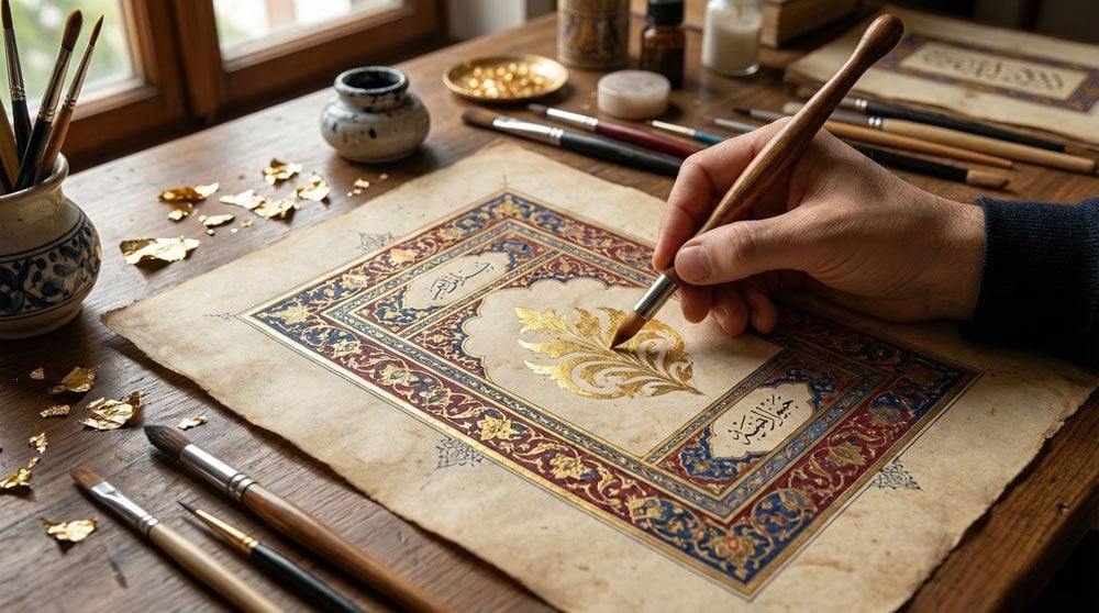 Mühre ile altın varak üzerindeki ince işçilik ve parlatma sahnesi.