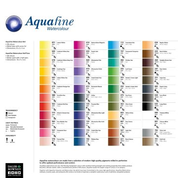 Daler-Rowney Artists' Watercolor ile aynı titiz standartlarda üretilen Aquafine sulu boyaları, optimum performans ve kontrol sunmak için mükemmel bir şekilde öğütülmüş modern yüksek kaliteli pigmentlerden yapılmıştır.