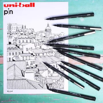 Solmaz ve suya dayanıklı pigment mürekkepli ince çizgi (fine line) akrilik uçlu kalem uni-ball PIN, sanatçılar ve tasarımcılar için genellikle ilk tercihtir.